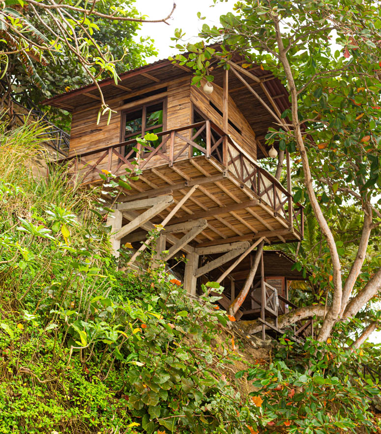 Cabaña de playa de gran espacio, volada a 8 metros de altura. Para personas exigentes, que disfrutan de lo rústico con confort. Acomodación en cama King con 2 camas individuales incluidas.
