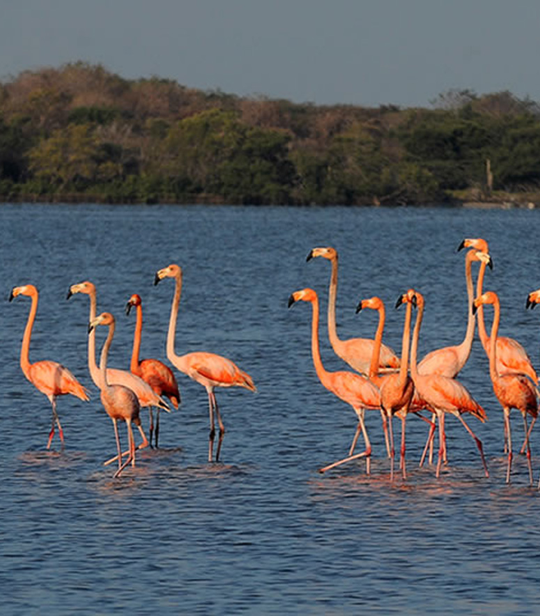 En una hora en automóvil desde Kaira, en el corregimiento de Caracoles en La Guajira colombiana, podrás observar uno de los espectáculos más maravillosos de la naturaleza, el avistamiento de los Flamencos rosados que llegan por miles para alimentarse en los salitrales de la zona. Debes llegar muy temprano para poderlos observar antes que levanten vuelo hacia otras aguas salobres. Alista tu cámara para registrar este momento inolvidable. Después visitaremos los restaurantes de la zona donde disfrutarás de la exquisita comida de mar que preparan de manera ancestral los lugareños.